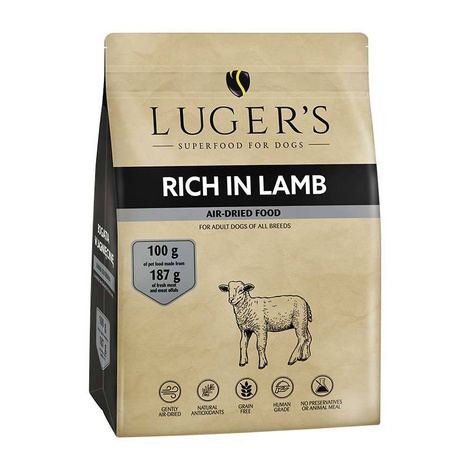 Luger’s bogata w jagnięcinę to pełnowartościowa karma suszona przeznaczona dla dorosłych psów wszystkich ras, pokrywająca ich dzienne zapotrzebowanie na wszystkie składniki odżywcze. Specjalna innowacyjna metoda produkcji polegająca na delikatnym suszeniu oraz odpowiednim doborze surowców sprawia, że karma jest lekkostrawna i idealnie dopasowana do wymogów żywieniowych dorosłych psów. Co więcej, właśnie dzięki suszeniu ciepłym powietrzem, do wyprodukowania 100 g karmy zostało użyte aż 187 g mięsa i podrobów, zachowując przy tym smakowitość oraz wszystkie wartości odżywcze. Urozmaicony i wartościowy skład produktów pochodzenia zwierzęcego z jagnięciny, wieprzowiny i wołowiny i kurczaka, które są źródłem białka, oraz niezbędne aminokwasy, zapewniają różnorodność składników odżywczych i tekstur, które w efektywny sposób stymulują procesy trawienne. Kwasy tłuszczowe z rodzin n-6 i n-3 stanowią doskonałe źródło energii oraz substancji kontrolujących przebieg procesów metabolicznych organizmu psa. Karma została skomponowana pod kątem zawartości wszystkich niezbędnych składników mineralnych, między innymi wapnia i fosforu, które gwarantują prawidłowe współdziałanie układów kostnego i mięśniowego. Dodatek warzyw, babki płesznik, drożdży piwnych oraz rozmarynu reguluje pracę przewodu pokarmowego oraz wpływa na funkcjonowanie wszystkich układów i narządów dorosłego psa. Dbając o przestrzeganie zalecanej ilości podawanej psu karmy, nie ma ryzyka powstania nadwagi czy otyłości.