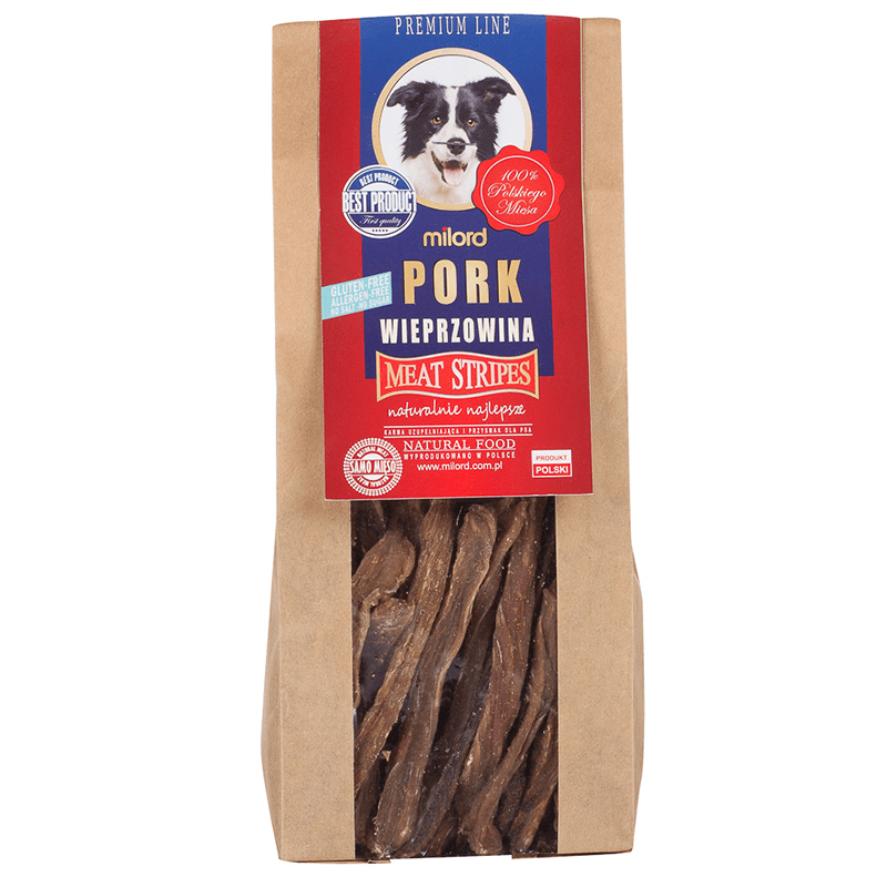 Przysmak dla psa z mięsa wieprzowego w formie pasków firmy Milord to smakowity dodatek do codziennej diety. Ręcznie krojone, specjalnie wyselekcjonowane mięso, które zostało poddane procesowi suszenia ciepłym powietrzem w niskich temperaturach to doskonała nagroda podczas codziennych treningów. Przysmaki wytworzone z szynki i schabu wieprzowego, a dzięki specjalnej metodzie produkcji są całkowicie wolne od dodatku konserwantów, gliceryny, wypełniaczy i wzmacniaczy smaku czy aromatu. Smakołyki zostały wyprodukowane w Polsce i sprawdzają się idealnie dla psów każdej rasy i wielkości.