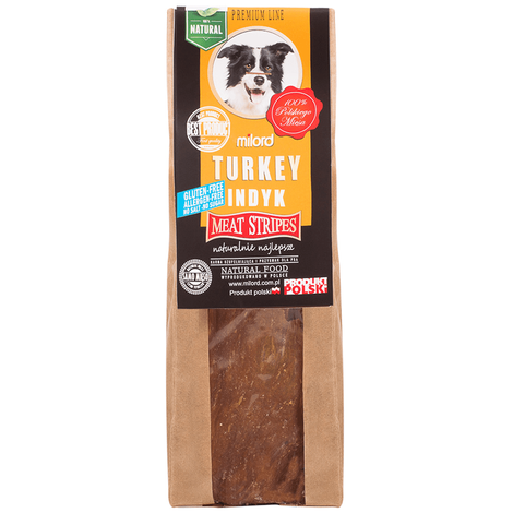 Kochasz swojego psa? Więc z pewnością wiesz, że psy kochają żuć! By uszczęśliwić pupila warto podać mu gryzak dla psa z mięsa z indyka w formie płatów firmy Milord. Ten wyjątkowy produkt składa się tylko z mięsa z piersi indyka i nie zawiera żadnych dodatków, konserwantów, wzmacniaczy czy gliceryny. Jest bezpieczny dla każdego psa i idealny zwłaszcza dla szczeniąt, a także psów małych i średnich ras. Wyjątkowa metoda produkcji, za pomocą suszenia ciepłym powietrzem w niskich temperaturach nadaje przekąsce wyjątkowej struktury i odpowiedniej elastyczności, co pozwala na oczyszczenie psich zębów z kamienia nazębnego.