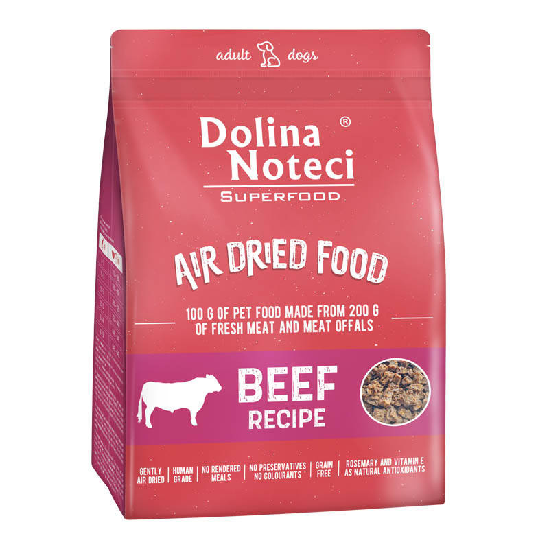 Dolina Noteci SUPERFOOD danie z wołowiny to pełnowartościowa karma suszona, zaspokaja w pełni potrzeby żywieniowe dorosłych psów wszystkich ras. Której skład surowcowy uwzględnia składniki odżywcze i związki biologicznie czynne. 100 g gotowego produktu powstaje z aż 200 g świeżego mięsa i produktów pochodzenia zwierzęcego z wołowiny, kurczaka i wieprzowiny. Proces delikatnego suszenia pozwala zachować jak najwięcej składników odżywczych pochodzących z surowców użytych do produkcji karmy. Mięso i produkty pochodzenia zwierzęcego z wołowiny dostarczają cennego białka bogatego w aminokwasy oraz stanowią źródło potrzebnych dla zdrowia pierwiastków -  selenu, żelaza i  miedzi. Wołowina jest także źródłem ważnej dla organizmu psa witaminy B12 oraz witamin rozpuszczalnych w tłuszczach. Dodatek jaja kurzego i tłuszczu z kurczaka wzbogaca karmę suszoną serii Dolina Noteci SUPERFOOD w niezbędne nienasycone kwasy tłuszczowe z rodziny n-6. Zawarte w marchwi, szpinaku, borówkach, malinach, pomarańczy i groszku związki biologicznie czynne charakteryzują się właściwościami przeciwutleniającymi i przeciwzapalnymi. W istotny sposób wpływają one na hamowanie zmian związanych ze starzeniem się, rozwojem miażdżycy i uszkodzeniami wątroby. Funkcje przewodu pokarmowego, zarówno trawienne, jak i wydzielnicze, są wspomagane dzięki uzupełnieniu karmy nasionami szałwii hiszpańskiej (chia), siemieniem lnianym, jukką Mojave oraz  wodorostami morskimi. Dodatek drożdży piwnych i inuliny z cykorii poprawia kondycję sierści oraz podtrzymuje prawidłowy skład flory jelitowej. Cennym dodatkiem w karmie suszonej serii Dolina Noteci SUPERFOOD są składniki pochodzące z omułka nowozelandzkiego, które odpowiadają za utrzymanie właściwego stanu chrząstki stawowej oraz działają przeciwzapalnie na tkankę kostną. Przestrzeganie zalecanej ilości podawanej psu karmy nie powoduje ryzyka powstania nadwagi czy otyłości. Dobrym uzupełnieniem diety opartej na karmie suszonej jest podawanie psu świeżej wody do picia, która w sposób naturalny  wspomaga przyswajanie składników w niej zawartych.