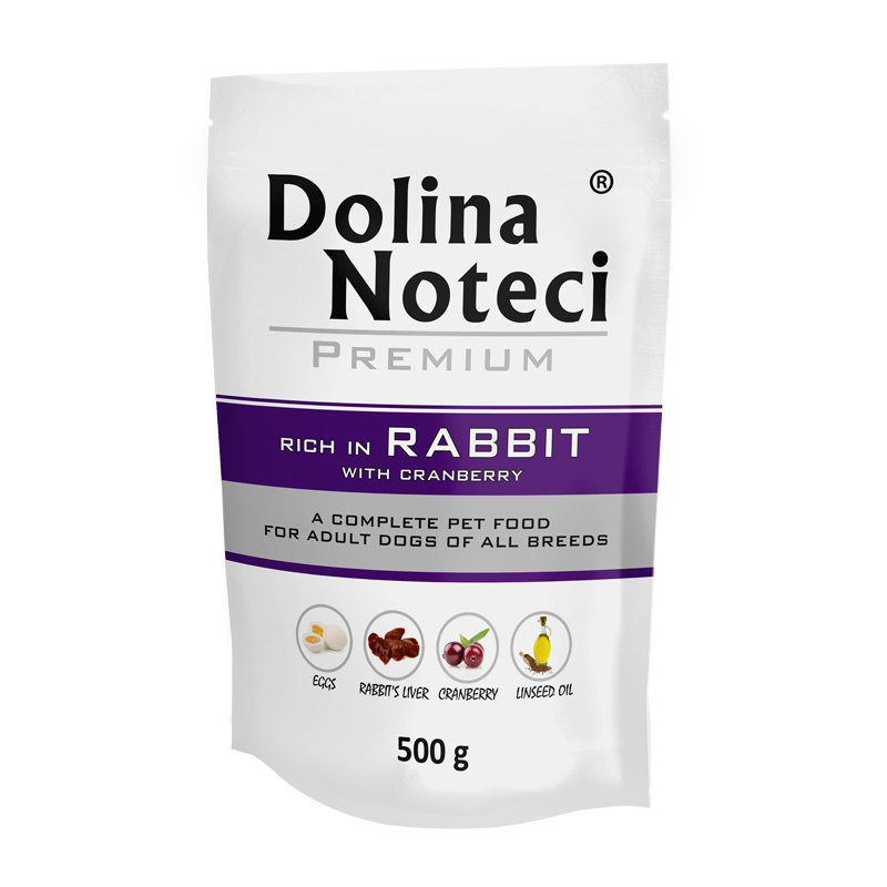 Karma Dolina Noteci PREMIUM bogata w królika z żurawiną będąca szczególnie cennym źródłem aminokwasów, lizyny i fenyloalaniny. Dodatkowo wysoka zawartość lizyny w mięsie królika zwiększa zawartość aminokwasów egzogennych o bardzo istotnym wpływie na większość procesów w organizmie. Dodatkowo zawartość selenu i żelaza odgrywa istotną rolę w stymulacji funkcji obronnych organizmu. Owoce żurawiny i nasiona psyllium stymulują prawidłowy przebieg procesów trawiennych oraz częstotliwość wypróżnień.