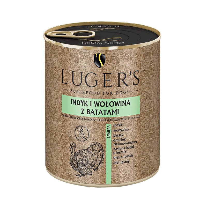 Bezglutenowaindyk 35% (mięso 10%, wątroba, żołądki, serca), wołowina 35% (płuca, wątroba, mięso 8%, żołądki, wymiona), rosół, bataty 4%, substancje mineralne, nasiona babki płesznik 0,2%, olej z łososia 0,2%, drożdże piwne suszone, olej lniany 0,1%, omułek nowozelandzki zielonowargowy 0,02%.
