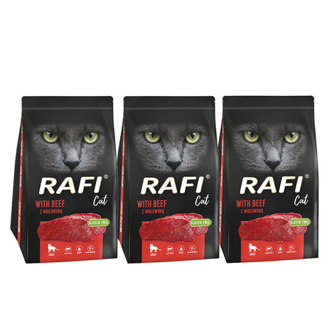 Wołowina to doskonałe źródło tauryny, która jest niezbędna w kociej diecie. Właśnie dlatego sucha karma dla kota Rafi Cat zawiera mięso wołowe najwyższej jakości.. Produkt jest bogaty w łatwostrawne białko i tłuszcze ułatwiające wchłanianie wysokokalorycznych elementów posiłku do organizmu. Ten pełnoporcjowy pokarm pokrywa w całości zapotrzebowanie czworonoga na wszystkie składniki odżywcze. Dodany do receptury olej z łososia jest źródłem kwasów n-3 i n-6, a drożdże dostarczają witamin, minerałów i składników o charakterze probiotycznym. Zawarte w karmie witaminy A,E i D3 utrzymują dobrą kondycję skóry i sierści, wspomagają odporność i pozytywnie wpływają na stan zębów i kości. Cynk i mangan również mają korzystny wpływ na skórę i sierść, zaś żelazo zmniejsza ryzyko wystąpienia anemii, natomiast jod wykazuje działanie regulujące przemiany materii. Karma Rafi Cat jest nie tylko bogata w wartościowe składniki, to przede wszystkim pyszny posiłek, w którym rozsmakuje się niejeden kot.