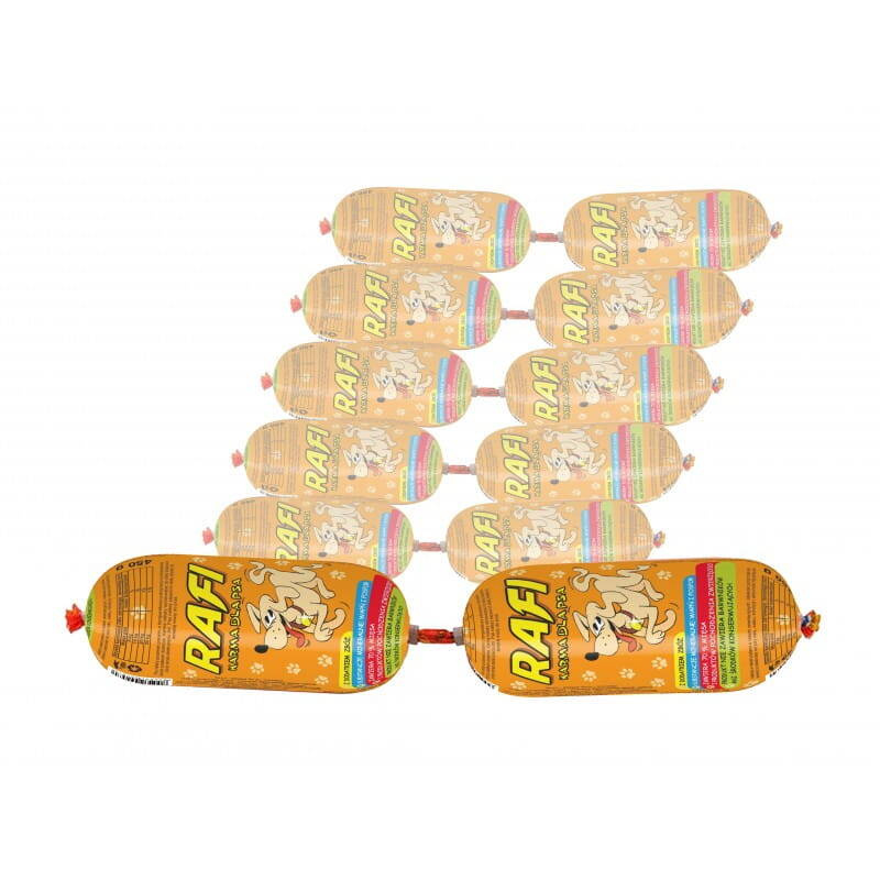 Karma Rafi to pełnoporcjowa karma mokra, zaspokajająca w pełni potrzeby żywieniowe dorosłych psów. Wysokiej jakości gatunki mięsa i surowce pochodzenia mięsnego są źródłem wysokostrawnego białka. Karma zawiera kwasy tłuszczowe w odpowiedniej ilości, aby procesy metaboliczne przebiegały prawidłowo, a pies o umiarkowanej aktywności fizycznej nie był narażony na nadwagę. Dodatek lekkostrawnych surowców roślinnych wpływa na odpowiednią pracę procesów trawiennych oraz regularność wypróżnień. Stały skład karmy RAFI gwarantuje codzienne dostarczenie niezbędnych składników odżywczych. Przestrzeganie sugerowanych przez producenta dziennych dawek karmy gwarantuje utrzymanie zbilansowanej diety, bez ryzyka pojawienia się otyłości.